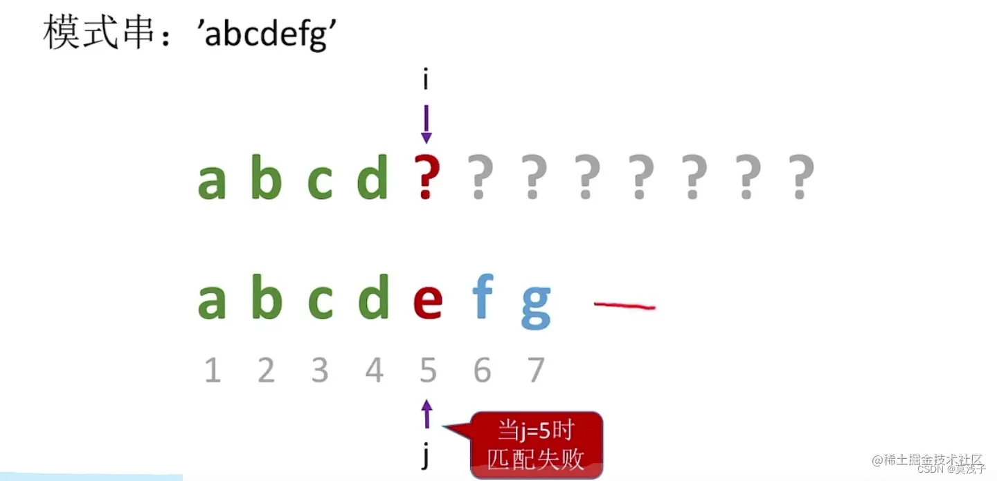 当 j = 5 匹配失败的时候,把字符往右移一格