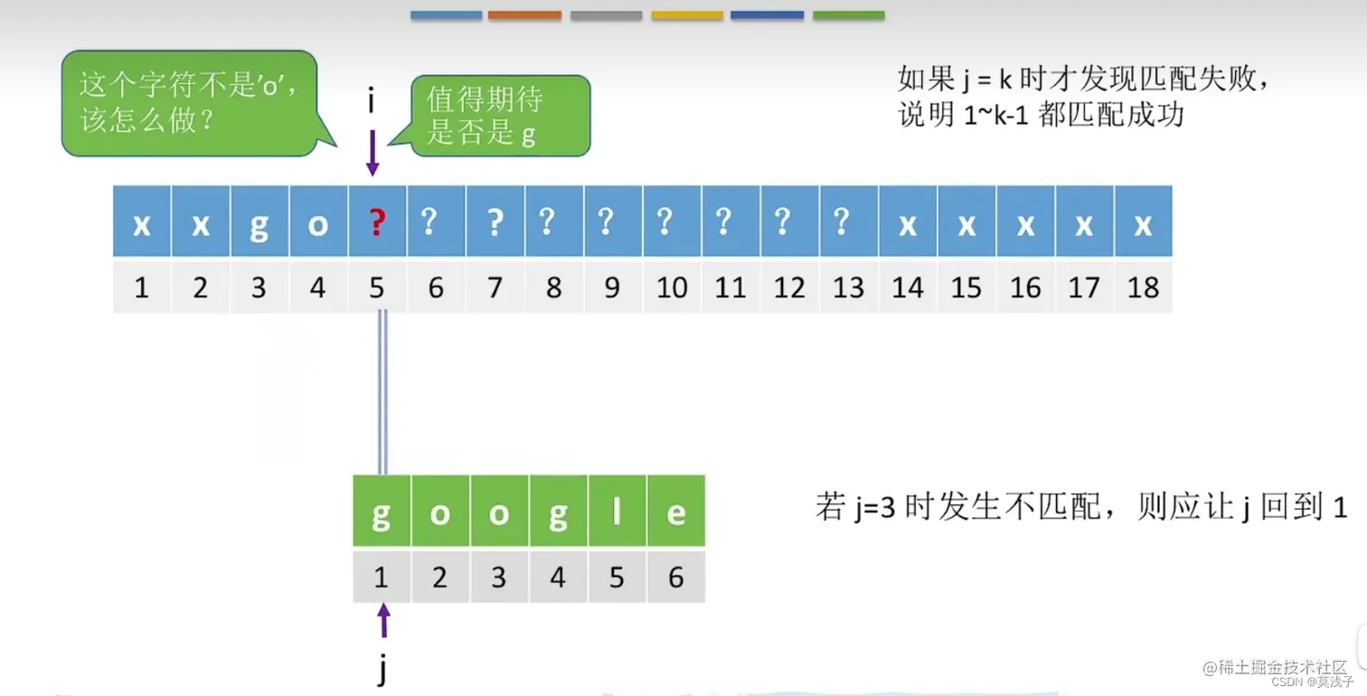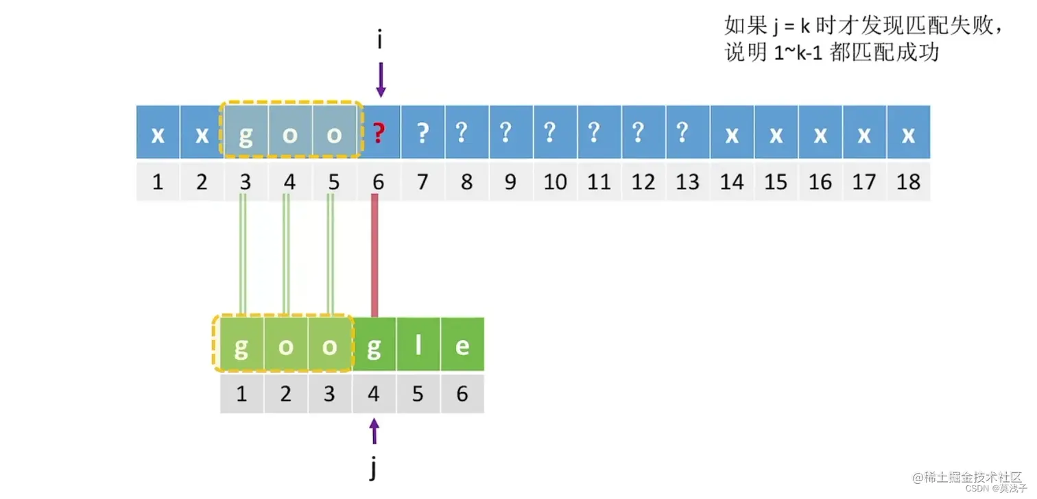 当 j = 4与i = 6,发生了不匹配 ,i = 4与 i = 5情况由于都是 o,一定不和 g 匹配,所以跳过,应该从i = 6 开始(但是实际上,i = 6 与 g 匹配过肯定不等于 g,这个情况先不考虑)
