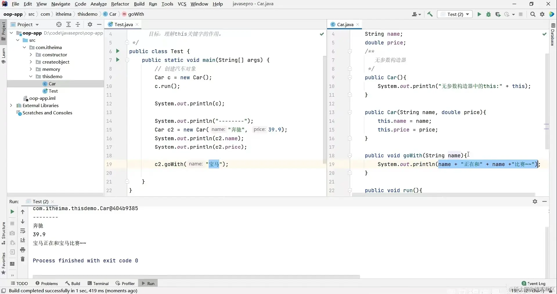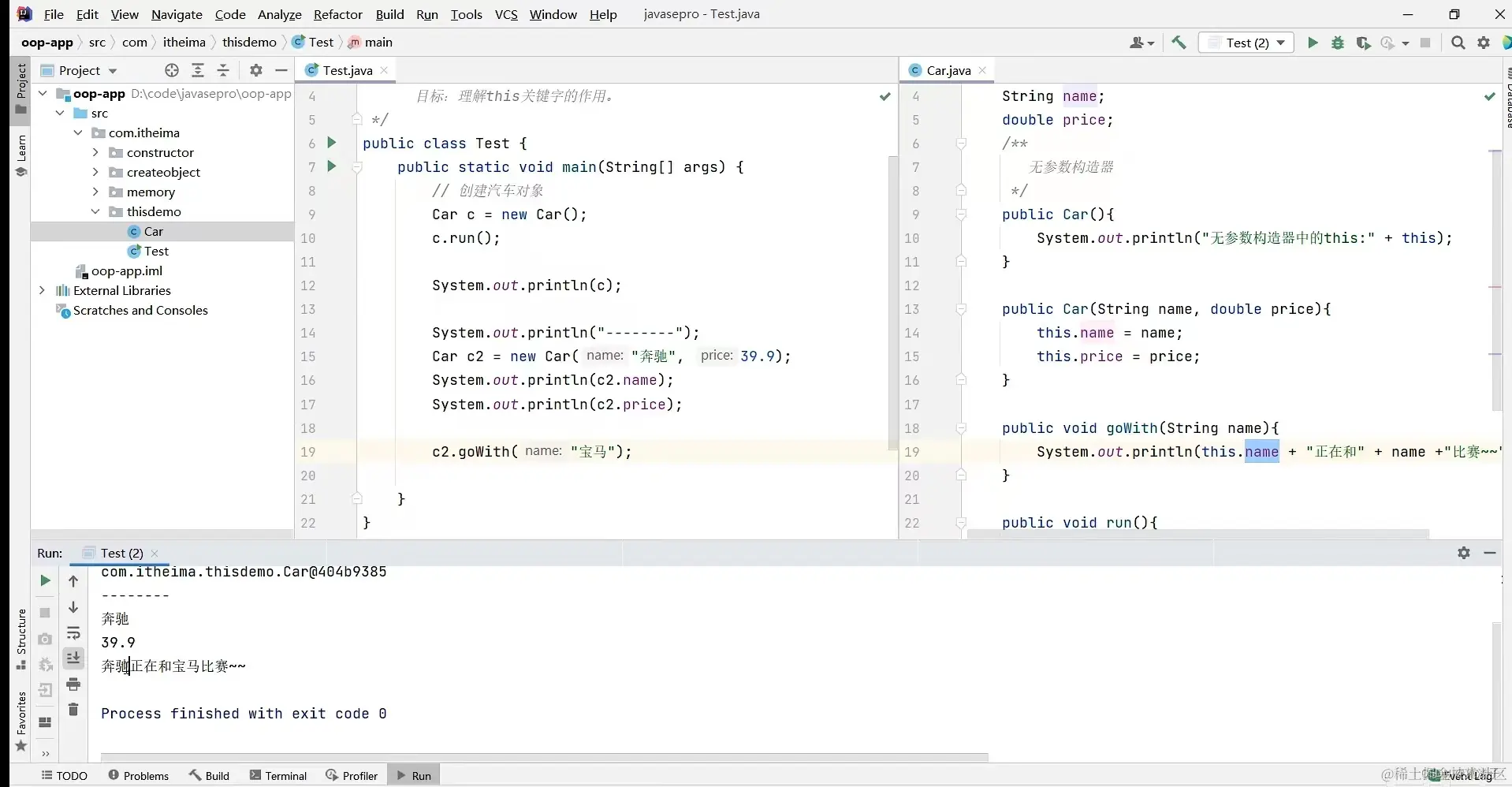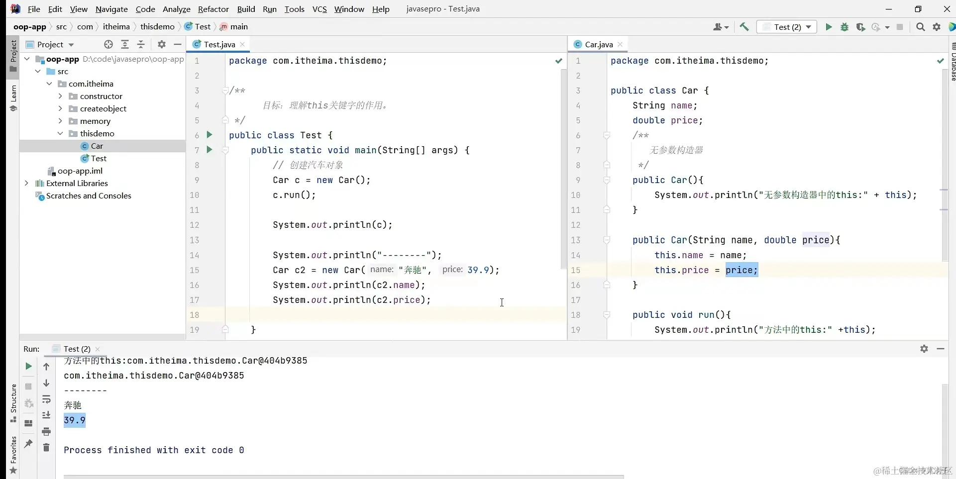 如果用了this关键字就可以正确的表示,表示为上面第一个String name里面的name赋值和double price 里面的price赋值