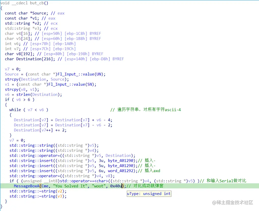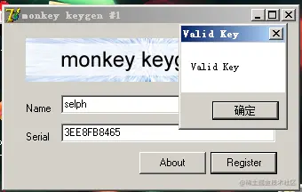首先以硬编码0xce6d和0x58bf创建了一个对象结构,然后读取Name,计算一个字符串,然后读取Serial字符串,进行比对,一样则表示成功,否则表示失败