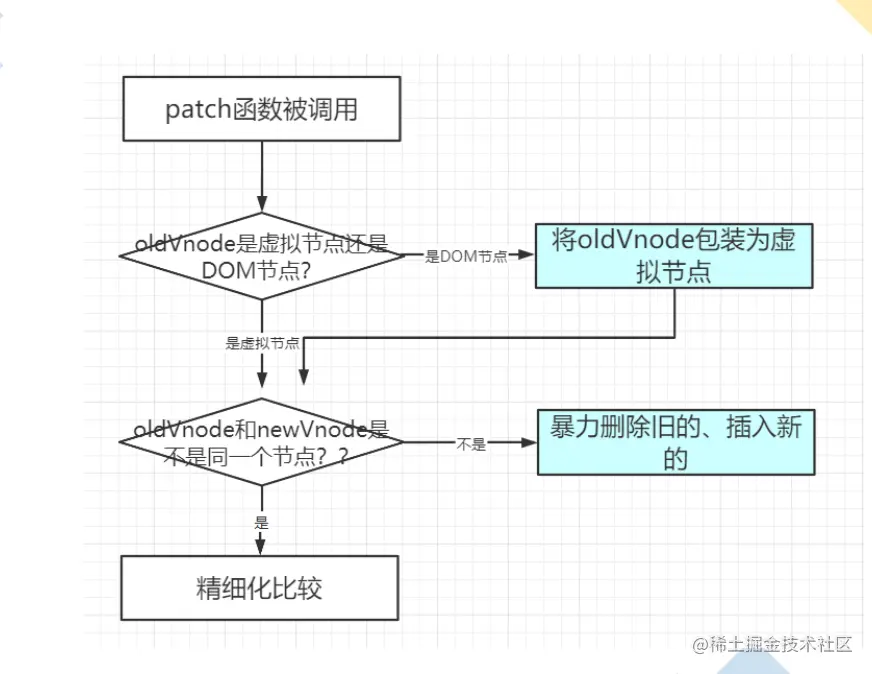 只有是同一个虚拟节点,才进行精细化比较,否则就是暴力删除旧的、插入新的。延伸问题:如何定义是同一个虚拟节点?答:选择器相同且key相同。 -