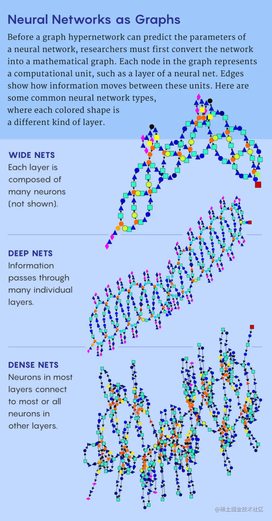 顾名思义,“图”指的是深度神经网络的架结构,可以认为是数学意义的图——由线或边连接的点或节点组成的集合。此处节点代表计算单元(通常是神经网络的一整层),边代表的是这些单元互连的方式。