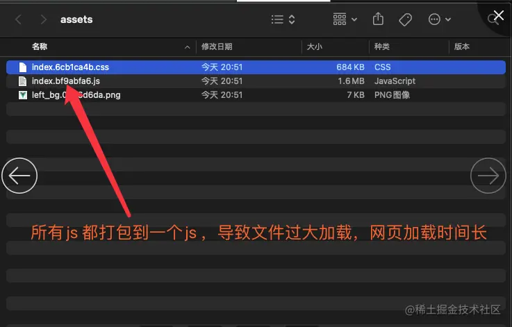 如图所示,所有的js都打包到一个js文件,导致文件过大,网页加载时间较长: