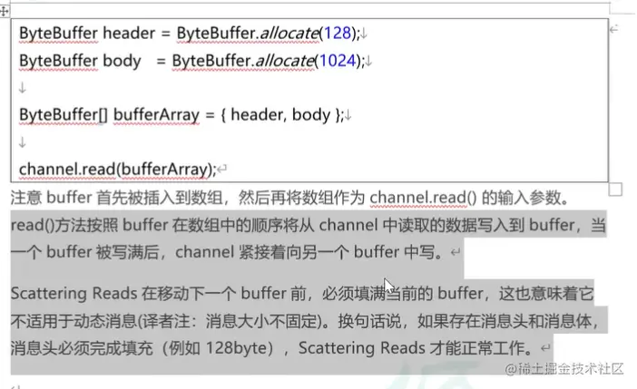 buffers数组是write()方法的入参,write()方法会按照 buffer在数组中的顺序,将数据写入到channel,注意只有position和limit之间的数据才会被写入。因此,如果一个buffer的容量为 128byte,但是仅仅包含58byte的数据,那么这58byte的数据将被写入到channel中。因此与Scattering Reads相反,Gathering Writes能较好的处理动态消息。