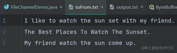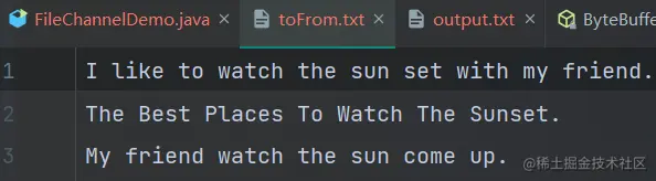 使用FileChannel读取数据之前需要先创建一个FileChannel实例,但我们无法直接创建,需要通过InputStream、OutputStream或者RandomAccessFile打开一个文件,然后使用getChannel方法获得。