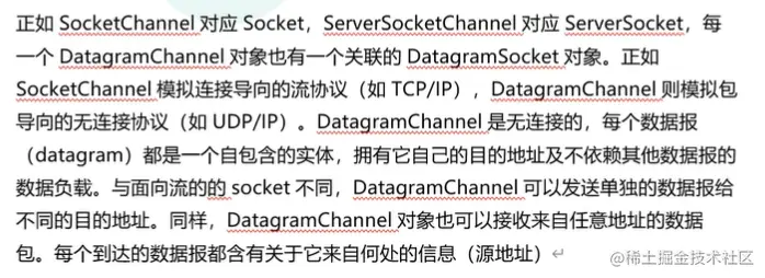 DatagramChannel是面向无连接协议UDP/IP的,每个数据包都是一个自包含的实体,包含自己地址+端口号和目标主机的目的地址+端口号,可以发送数据包到不同的地址,也可以接受来自其他地址的数据包,不区分客户端和服务器端。详细描述如下: