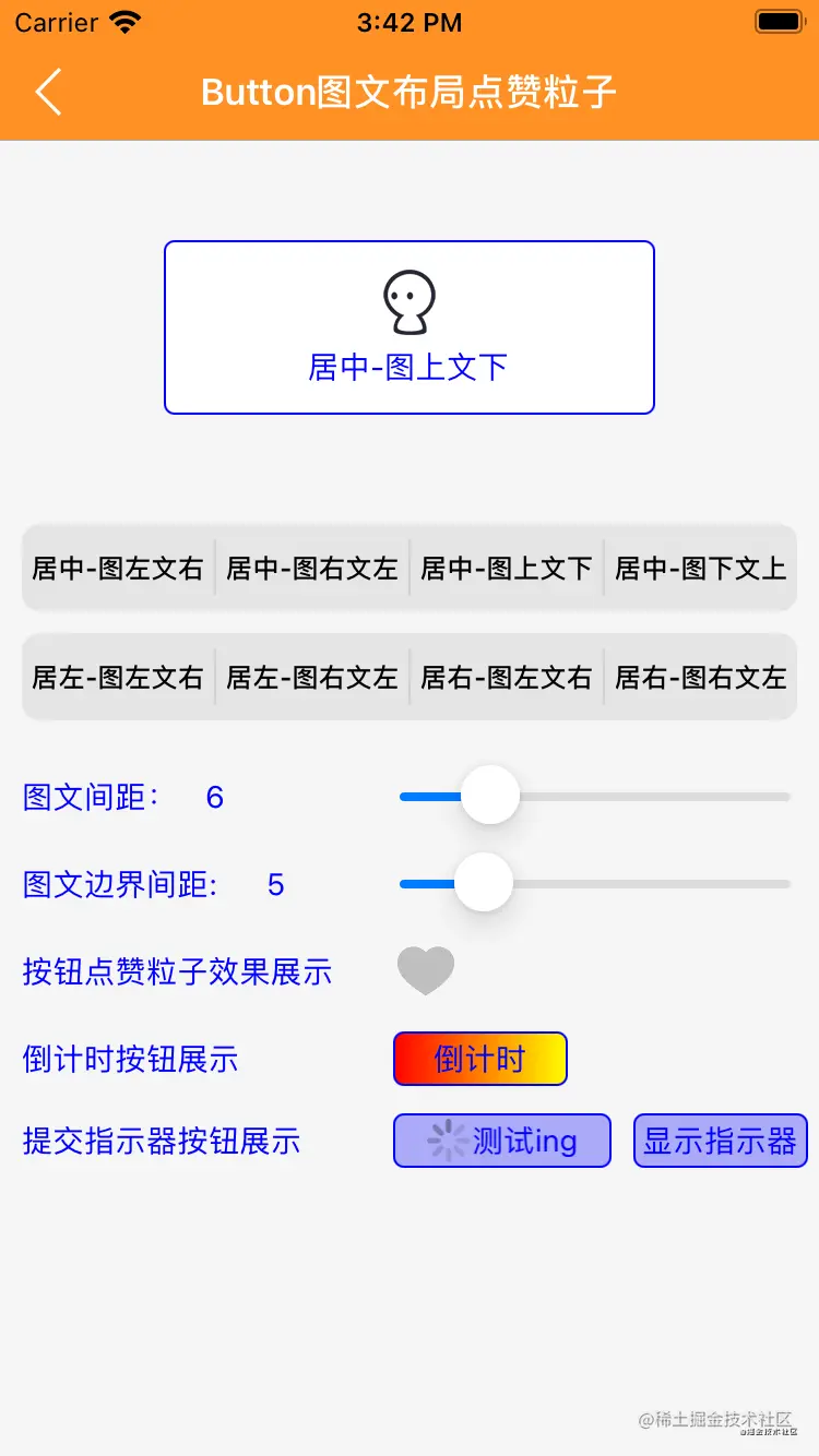 - UIButton:图文混排、事件封装、扩大点击域、时间间隔限制、倒计时、点击粒子效果等;