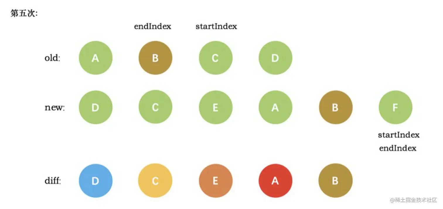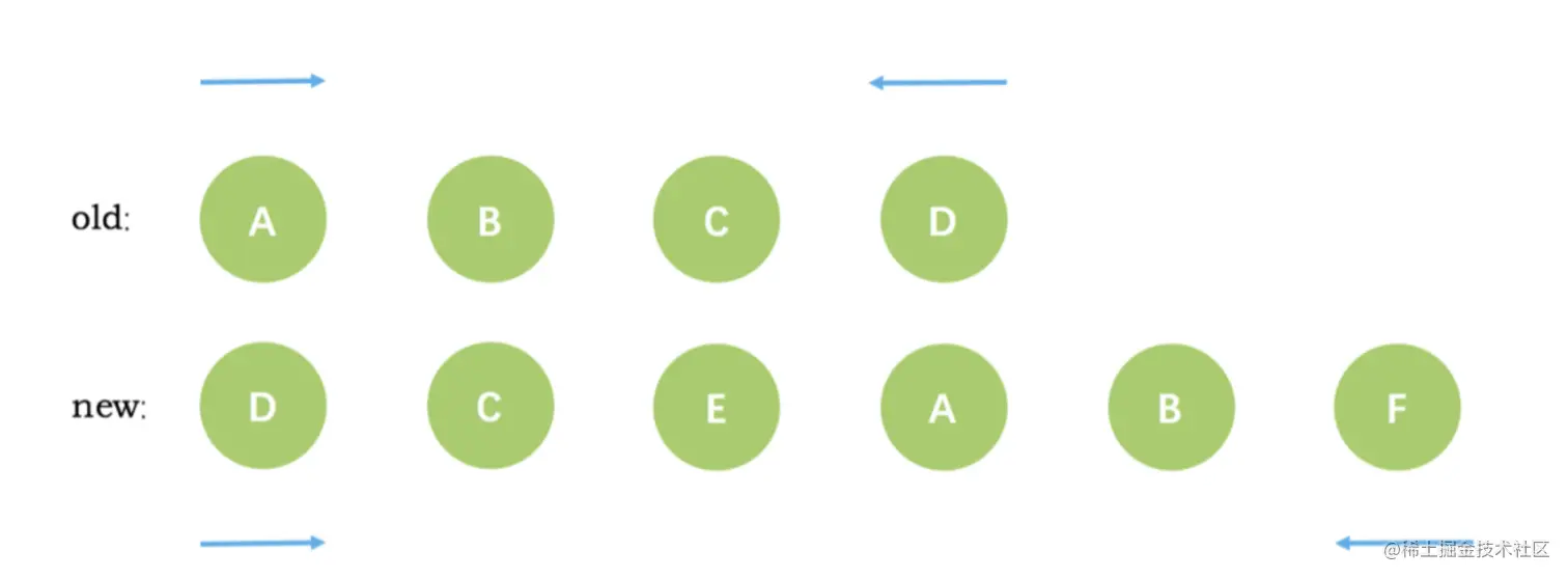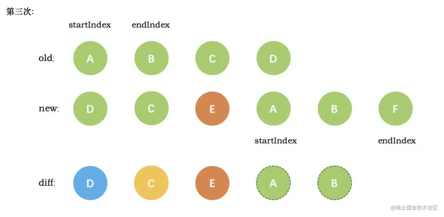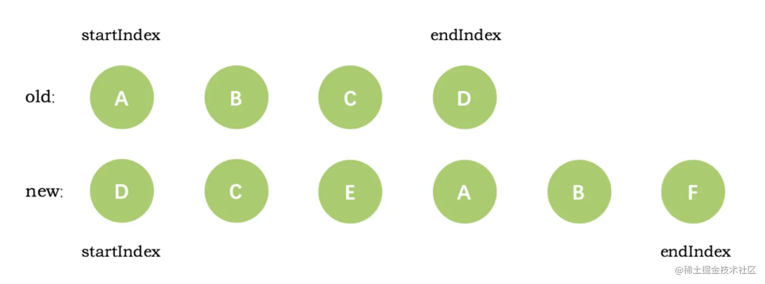 VNode节点的start和新VNode节点的end相同时,这时候在patchVnode后,还需要将当前真实dom节点移动到oldEndVnode的后面,同时老VNode节点开始索引加 1,新VNode节点的结束索引减 1 - 当老
