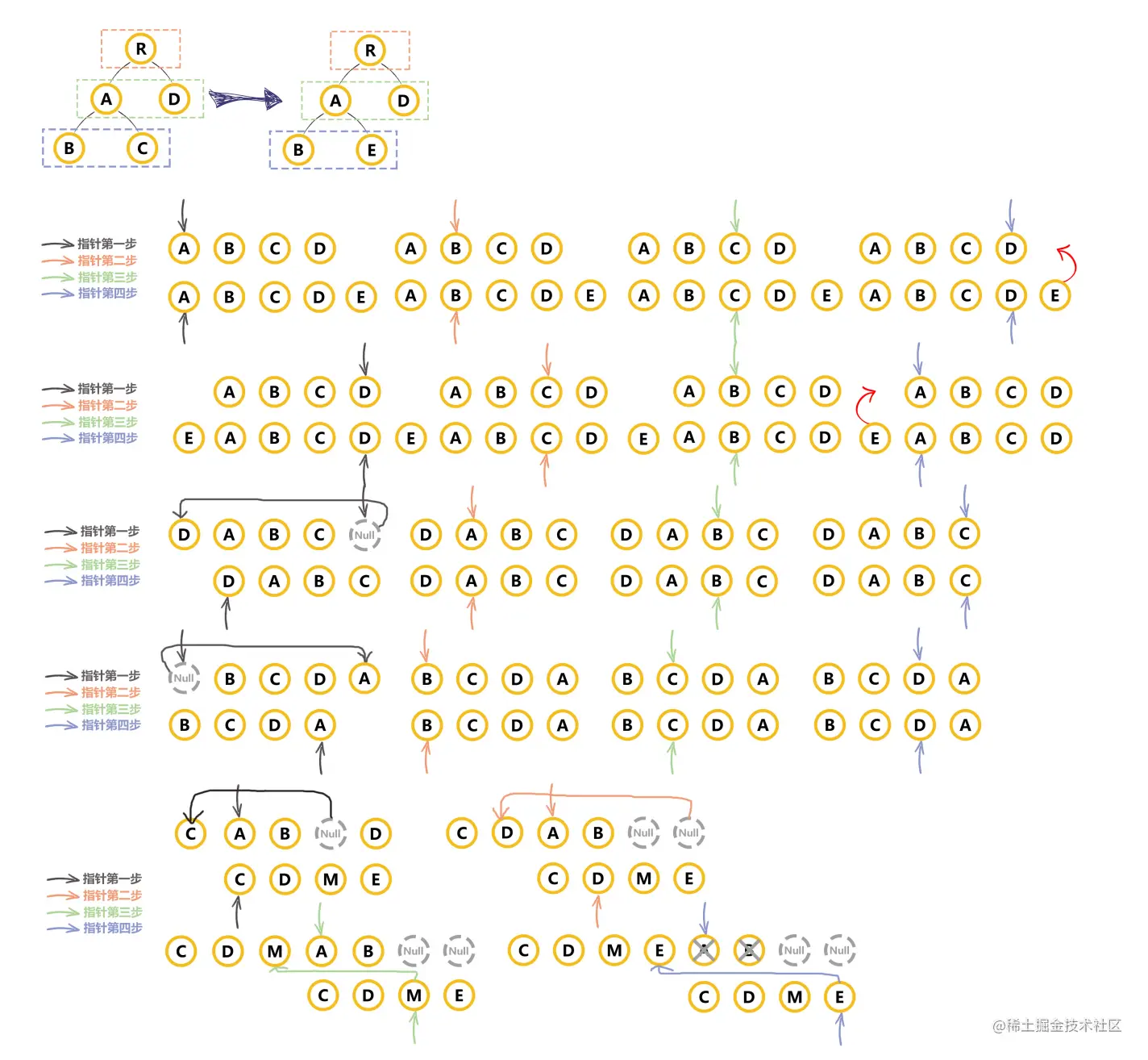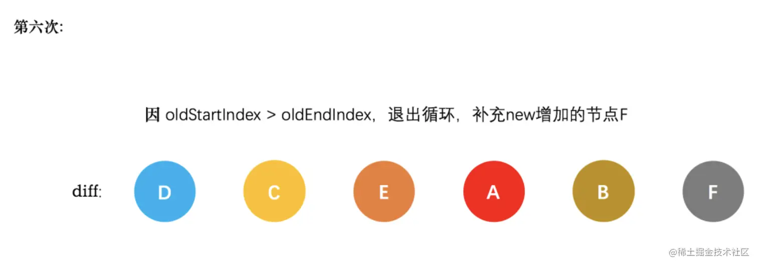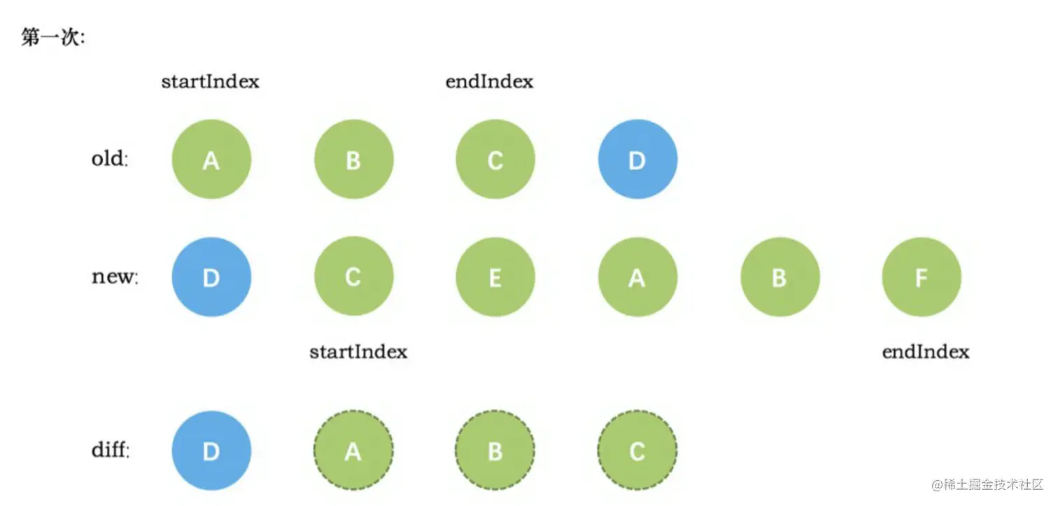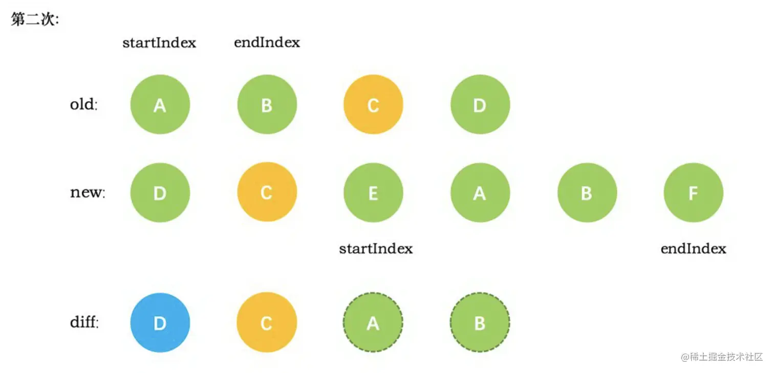 VNode节点的start和新VNode节点的end相同时,这时候在patchVnode后,还需要将当前真实dom节点移动到oldEndVnode的后面,同时老VNode节点开始索引加 1,新VNode节点的结束索引减 1 - 当老