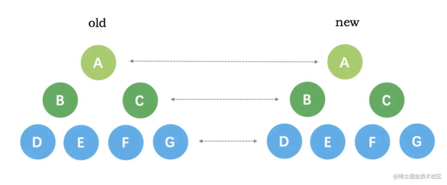 - 新的子节点是数组,老的子节点也是数组,那么比较两组子节点,更新细节blabla
