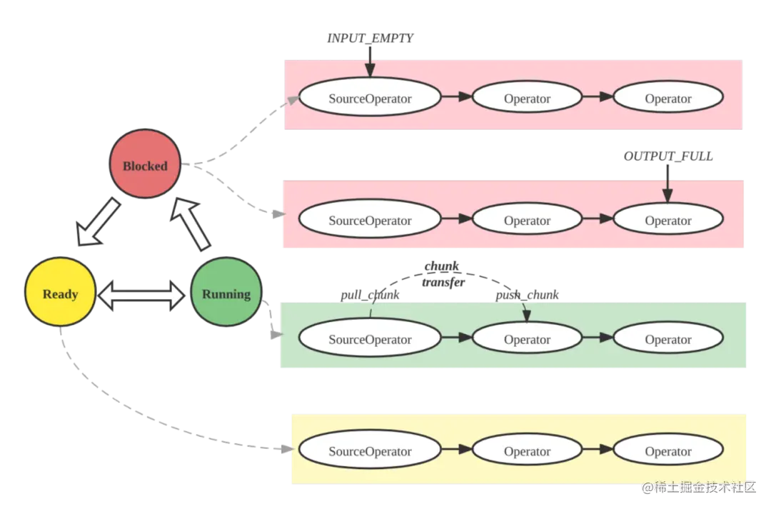 PipelineDriver 也是 Pipeline 执行引擎的基本调度单位,其本质上是一个协程,具有三种状态:Ready、Running 和 Blocked。