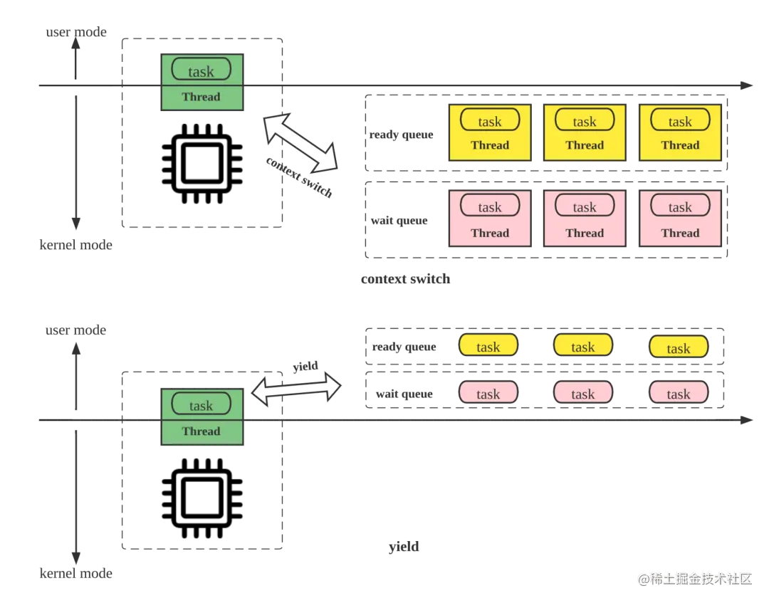 Pipeline 引擎中协程调度模型和传统的线程调度模型的主要区别是,前者实现了用户态的 yield 语义,而后者依赖 OS 的线程调度,在高并发场景下的频繁的上下文切换增加了调度成本,降低了 CPU 的有效利用率。如下图所示: