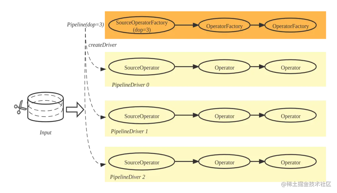 PipelineDriver 是 Pipeline 实例,一条 Pipeline 可以产生多个 PipelineDriver。在代码实现中,Pipeline 由一组 OperatorFactory 构成, Pipeline 可以调用 OperatorFactory 的 create 方法,生成一组 Operator,这组 Operator 即构成 PipelineDriver。如下图所示,根据 dop=3(degree-of-parallelism),Pipeline 实例化 3 条 PipelineDriver,输入数据也被拆分成三部分,每个 PipelineDriver 各自处理一部分。