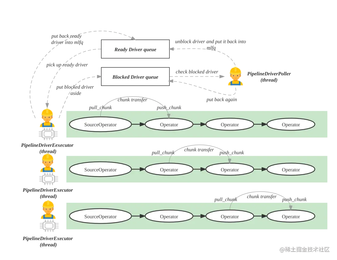 - 执行线程 PipelineDriverExecutor: 不断地从就绪 Driver 队列中获得就绪态的 PipelineDriver 并执行,把主动让出 CPU 的PipelineDriver 再次放回就绪 Driver 队列,把处于阻塞态 PipelineDriver 放入阻塞 Driver 队列。