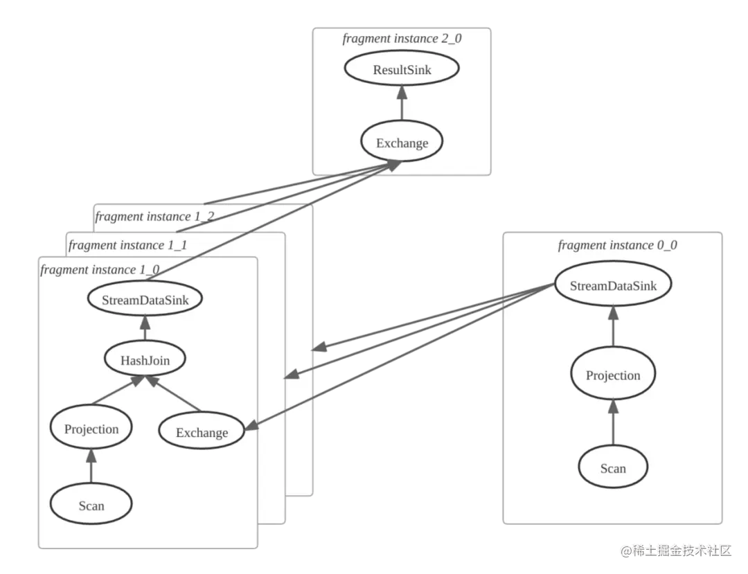 第二步: FE 确定 PlanFragment 的实例数量,创建 Fragment Instance。如果一个 Fragment Instance 把另外一个 Fragment Instance 的输出结果作为输入, 则产生数据的一方为上游, 输入数据的一方为下游,上游插入 DataStreamSink 用来发送数据,下游插入 ExchangeNode 算子用来接收数据。如下图所示,其中 PlanFragment 1 有 3 个 Fragment Instance。