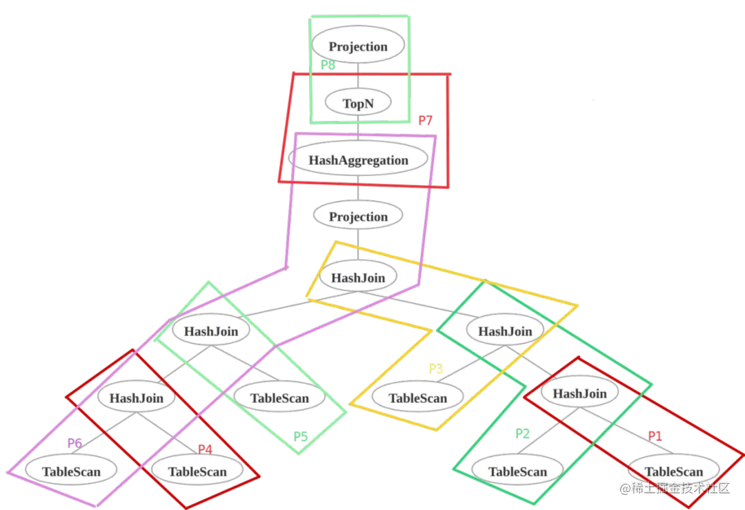 以 TPCH-Q5 为例,执行计划,可以划分成若干条 Pipeline,Pipeline 之间也存在上下游数据依赖。如下图所示:
