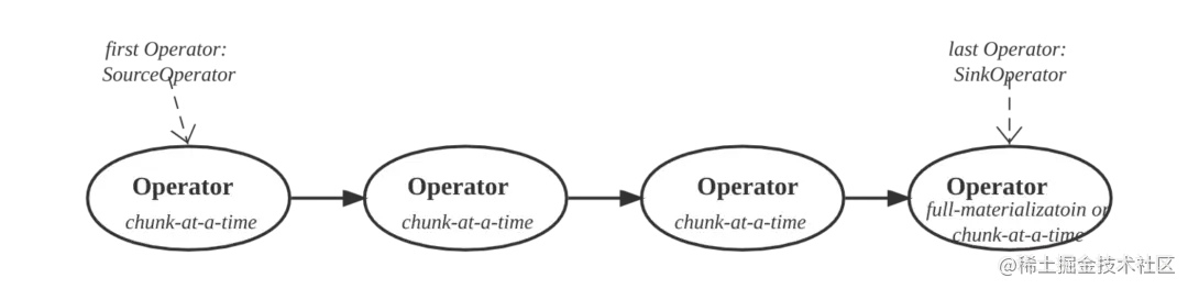 Pipeline 是一组算子构成的链,开始算子为 SourceOperator,末尾算子为 SinkOperator。Pipeline 中间的算子只有一个输入端和输出端。