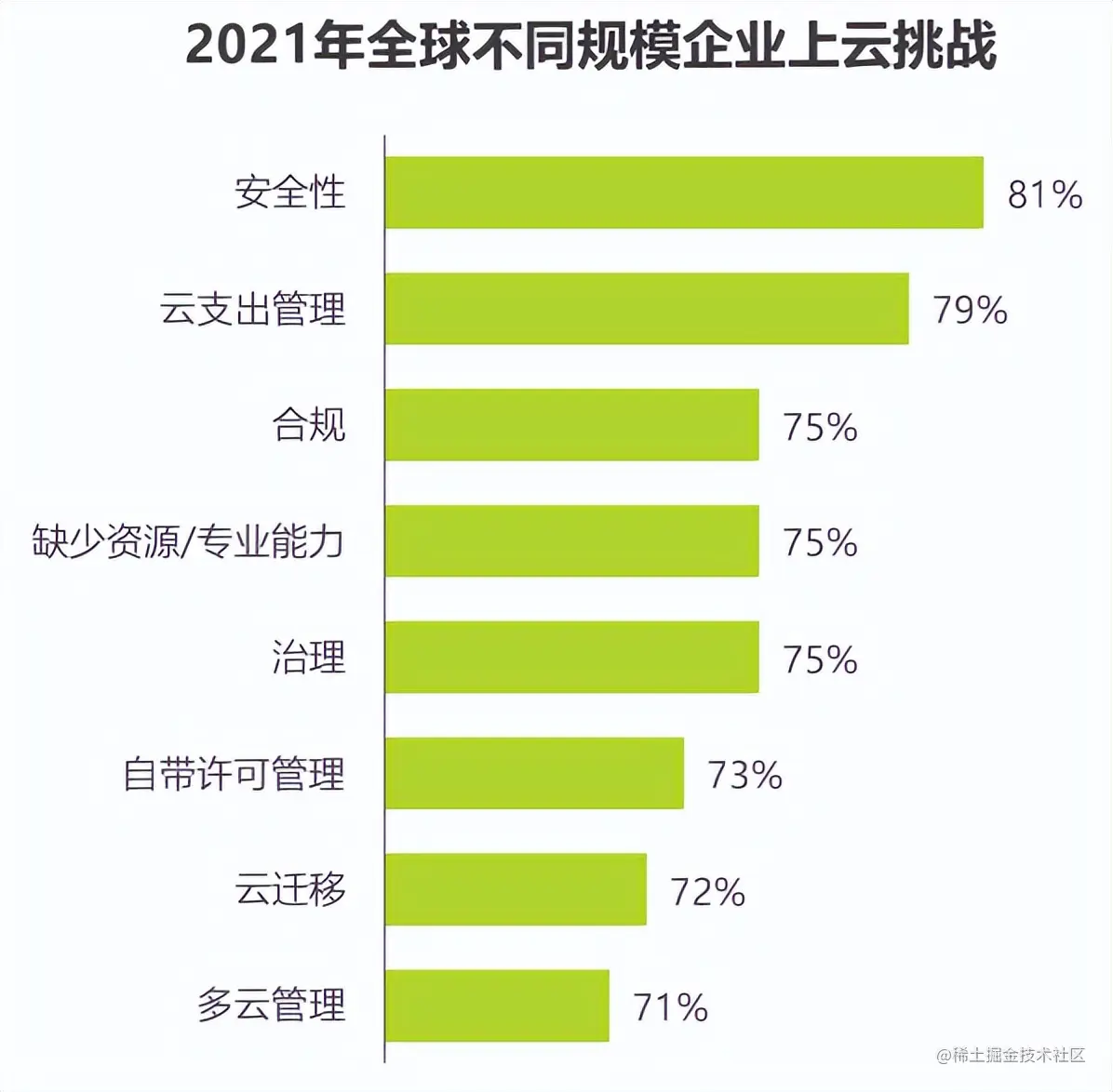 2021年的调查就显示,目前全球不同规模企业所面临的的上云挑战中,安全性已经排到了首位。在可见的未来,云安全已经进入一个发展的黄金阶段。