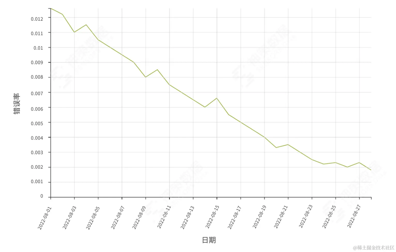 2、单客户平均请求报错数。重点度量客户的前端使用体验,统计客户侧直观的报错数据量。