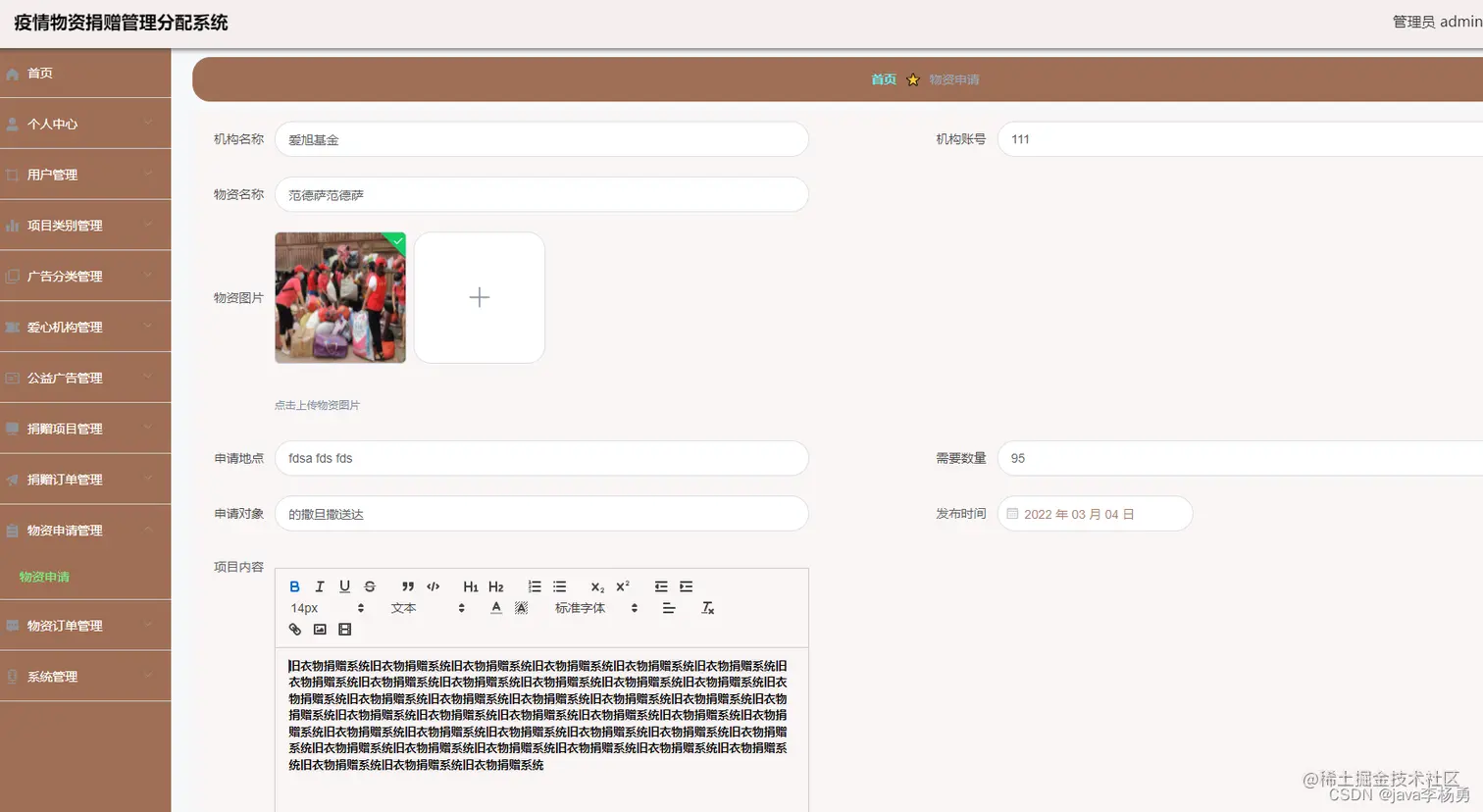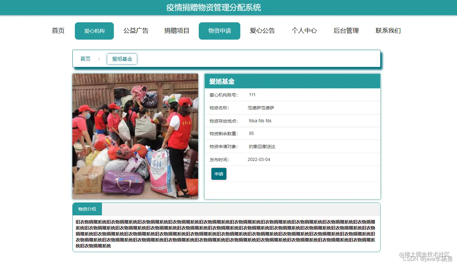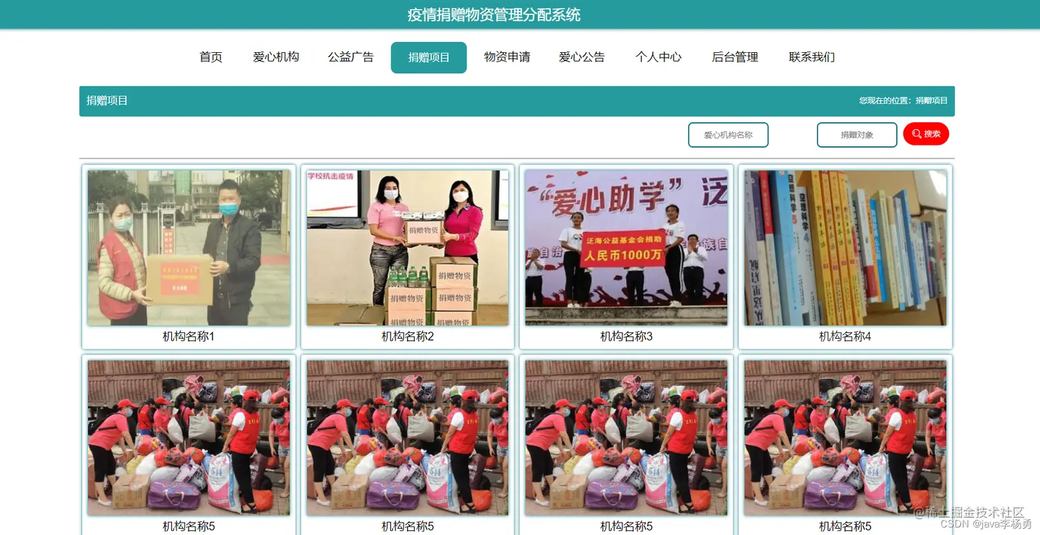3、功能的完善性:可以管理首页、个人中心、用户管理、项目类别管理、广告分类管理、机构管理、广告信息管理、捐赠项目管理、物资信息管理,物资申请,审核,物资订单等,捐赠订单管理以及系统管理模块的修改和维护操作。
