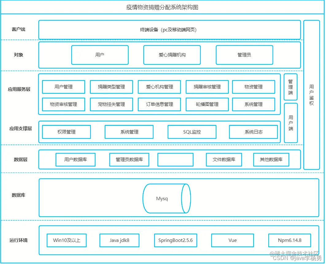 系统架构图属于系统设计阶段,系统架构图只是这个阶段一个产物,系统的总体架构决定了整个系统的模式,是系统的基础。疫情物资捐赠分配系统的整体结构设计如图所示。