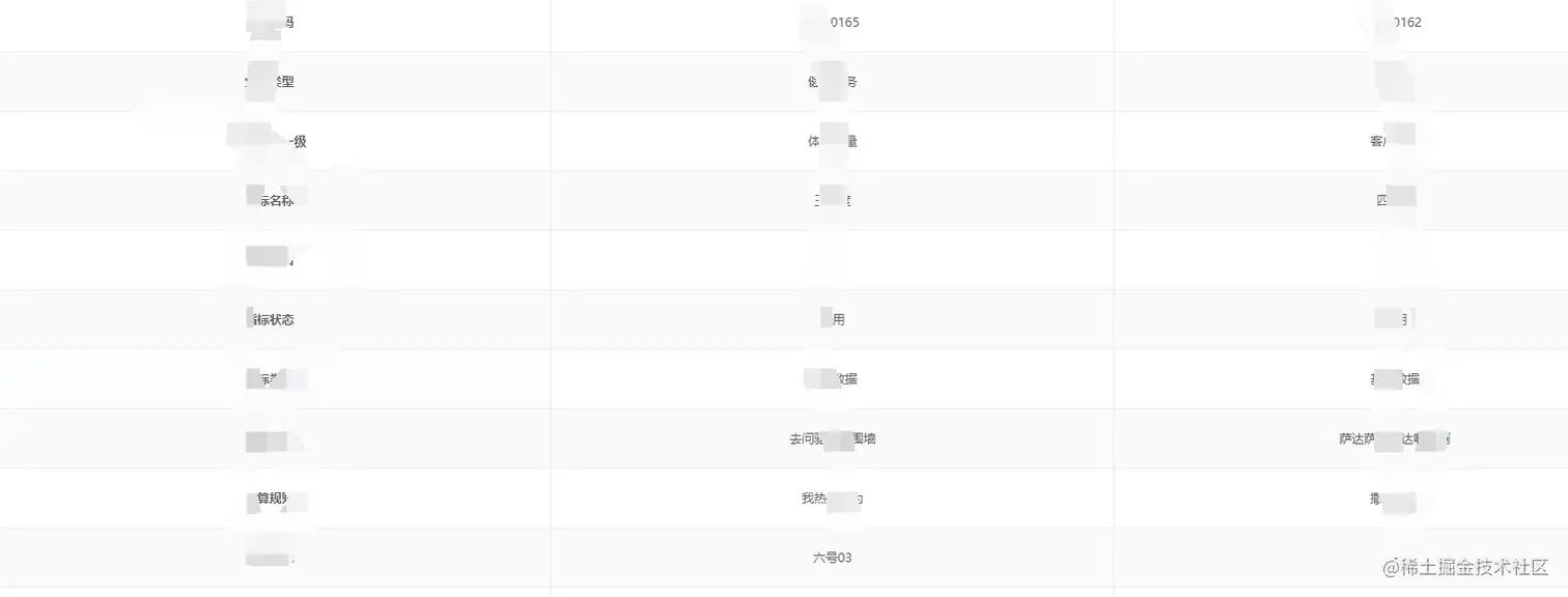 (:处于数据的保密性,我上了马赛克,如上图,左列是表头,右边是表头对应的数据,开始产品说这是一个纯展示的界面,于是,我是这样处理的: