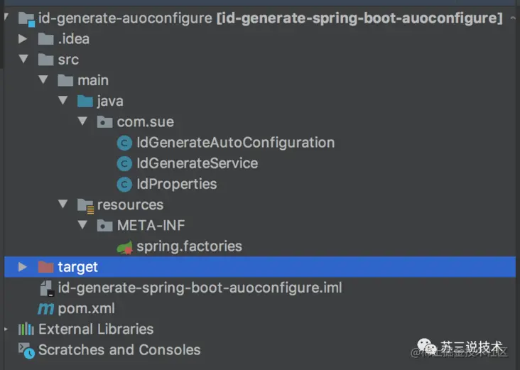 该jar包核心内容是:IdGenerateConfiguration,这个配置类中创建了IdGenerateService对象,IdGenerateService是我们所需要自动配置的具体功能。