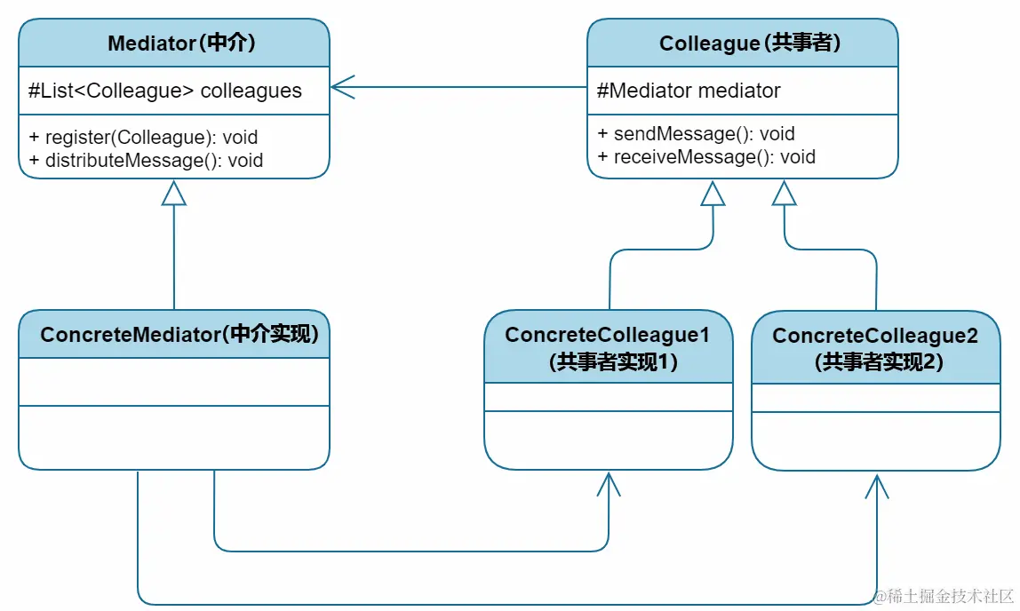 Colleague(共事者)、ConcreteColleague(共事实现):共事者可以有多种共事者实现。共事者持有中介对象的引用,以使其在发送消息时可以调用中介,并由它转发给其他共事者对象。对应本章例程中的用户类User。