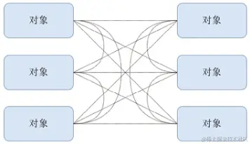 对象间这种千丝万缕的耦合关系会带来很大的麻烦,当我们要加入或减少一个参会人时,都要将其同步更新给所有人,每个人发送消息时都要先查找一遍消息接收方,从而产生很多重复工作。我们陷入了一种多对多的对象关联陷阱,这让复杂的对象关系难以维护,所以必须重新考虑更合理的设计模式。