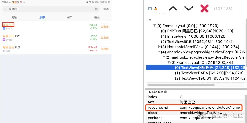 2)接着我们就必须从 tag 页内部来找标志控件了,我们发现在“股票”和“用户”页中搜索出来的结果名称的 id 是不同的: