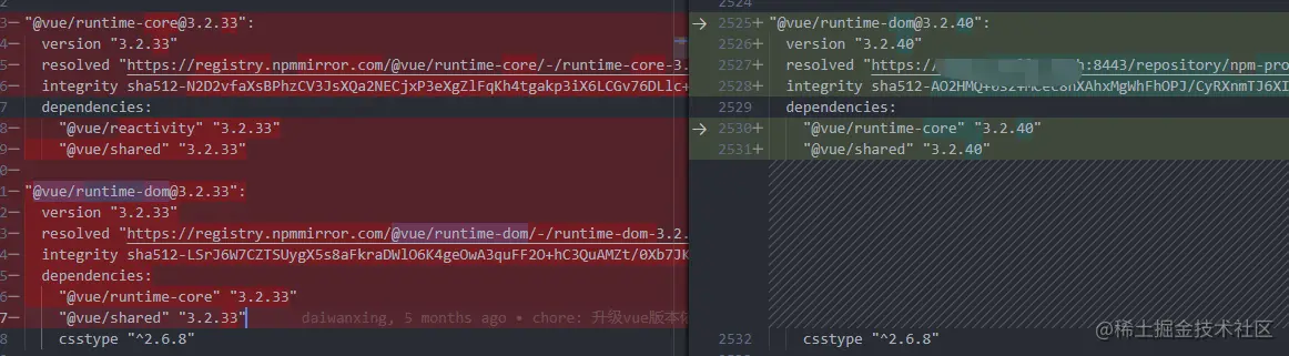 而这个变化是由于vue的版本号变化引起的,这是因为我的vue版本约束是~3.2.29,重新生成 lock 文件时会检查有没有较新的版本。