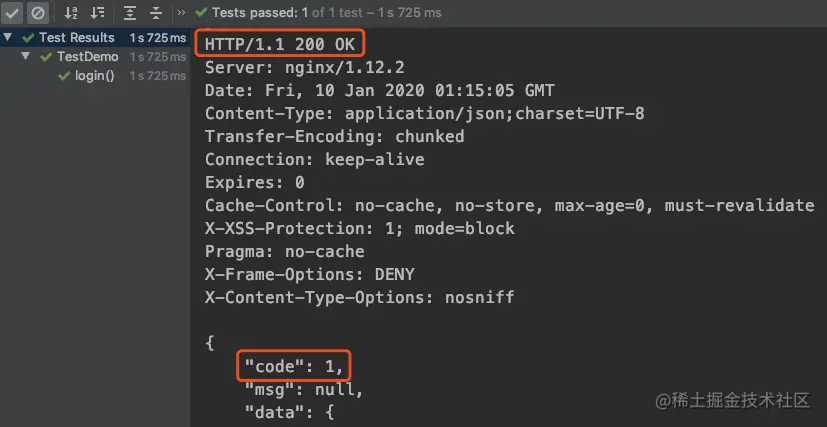 其中statusCode(200)是对状态码的断言,判断状态码是否为200; body(“code”,equalTo(1))是对返回体中的 code 进行断言,要求返回 code值为1 。