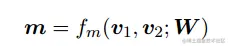 v_1和v_2是两个D维向量,W是可训练参数,m是视角或者说是选取的特征的数量,和返回值m是一个l维向量m =[m1...m2...ml]。每个mk是第k个角度的一个值,这个值是由两个加权向量的余弦相似度计算得到: