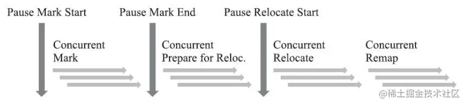 ZGC 的垃圾回收过程分为四个阶段,都是可以并发执行的,其阶段分别是: 并发标记、并发预备重分配、并发重分配和并发重映射。具体的过程如下图所示: