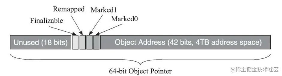 ZGC 的并发整理算法实现是依靠染色指针技术和读屏障来实现的,我们都知道在操作系统中,指针的大小一般都是 4 字节 32 为, 在 64 位的操作系统中,指针的大小是 8 字节 64 位,这样理论上最大访问的内存高达 16EB。但是在实际操作中,对象寻址只用了 42 位,高四位用来作为标识(Finalizable 即对象是否销毁标识,remapped 是否进入重分配集, marked0 和 marked1 即是标记指针的三色标记)。