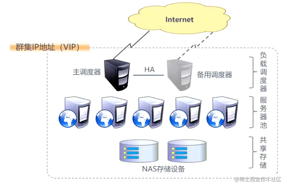 访问整个群集系统的唯一入口,对外使用所有服务器共有的VIP地址,也称为群集 IP地址。通常会配置主、备两台调度器实现热备份,当主调度器失效以后能够平滑 替换至备用调度器,确保高可用性。
