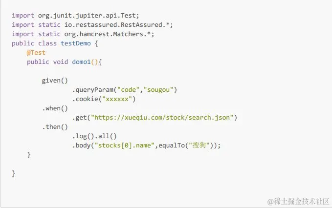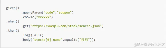 答:given用于放置需要的参数,比如上面例子中,我将访问参数:code和cookie放到了given里;when用于填 写要访问的url;then进行断言,来来判断结果是否正确。