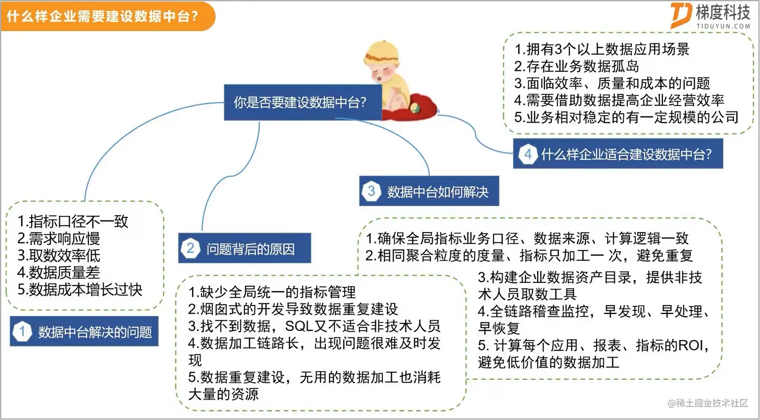 数据中台主要解决指标口径不一致、需求响应慢、取数效率低、数据质量差、数据成本增长过快的问题。当企业拥有3个以上数据应用场景、存在业务数据孤岛、面临效率质量和成本攀升的问题时、需要借助数据提高企业经营效率。