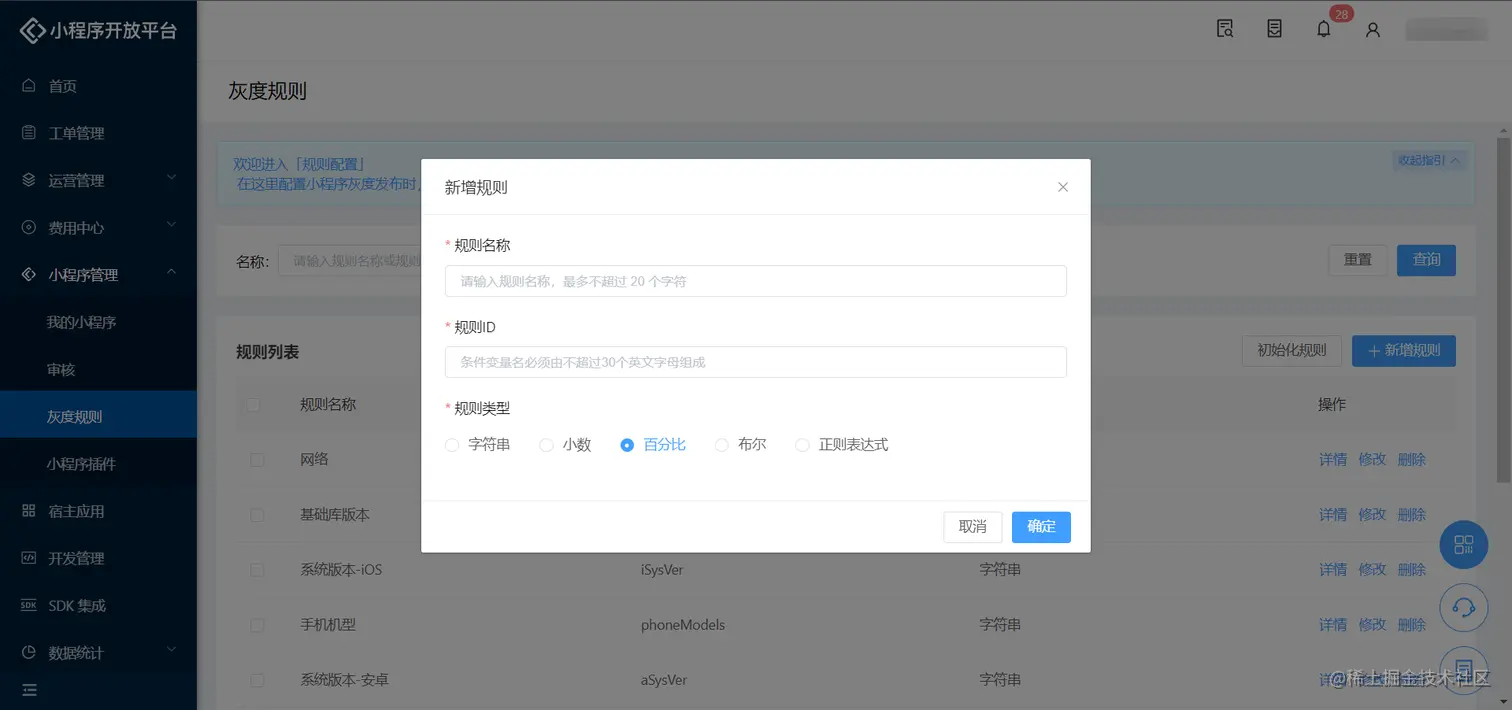 根据用户的反馈,我们在管理后台增加可按照“百分比”进行的灰度规则,小程序可通过移动端的设备 ID 进行算法计算,按照设定的“百分比”进行灰度推送。