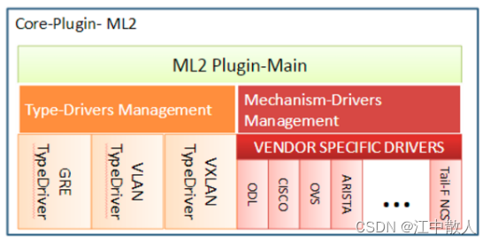 ML2 的plugin都是属于core。分为type和mechanism两种。Type drivers (如flat, VLAN, GRE 和VXLAN) 定义 L2 type。 mechanism drivers (如OVS, adrivers from ODL, Cisco, NEC, etc) 负责一系列动作(更新、创建、删除)网络、子网、端口。