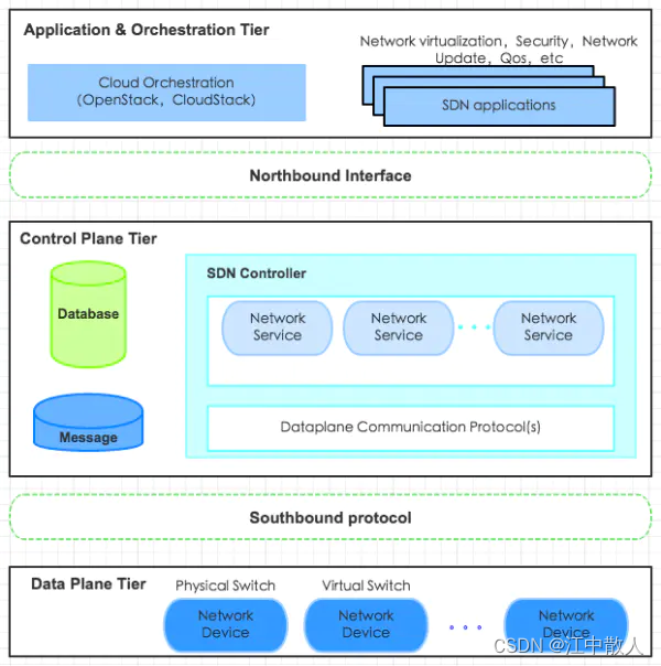 Application & Orchestration Tier通过Northbound Interface接入SDN Controller。这个接口通常是,但不局限于是RESTful API。像ODL还提供了OSGI接口,而OVN和Dragonflow直接提供DB读写的接口。