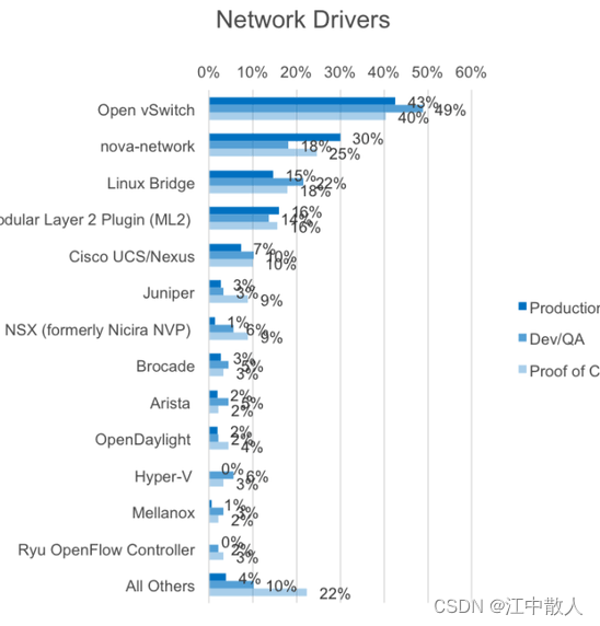 下图是2014年的一个调查,时过境迁,nova-network已经被废弃,OpenvSwitch如今的占有率肯定会更高。