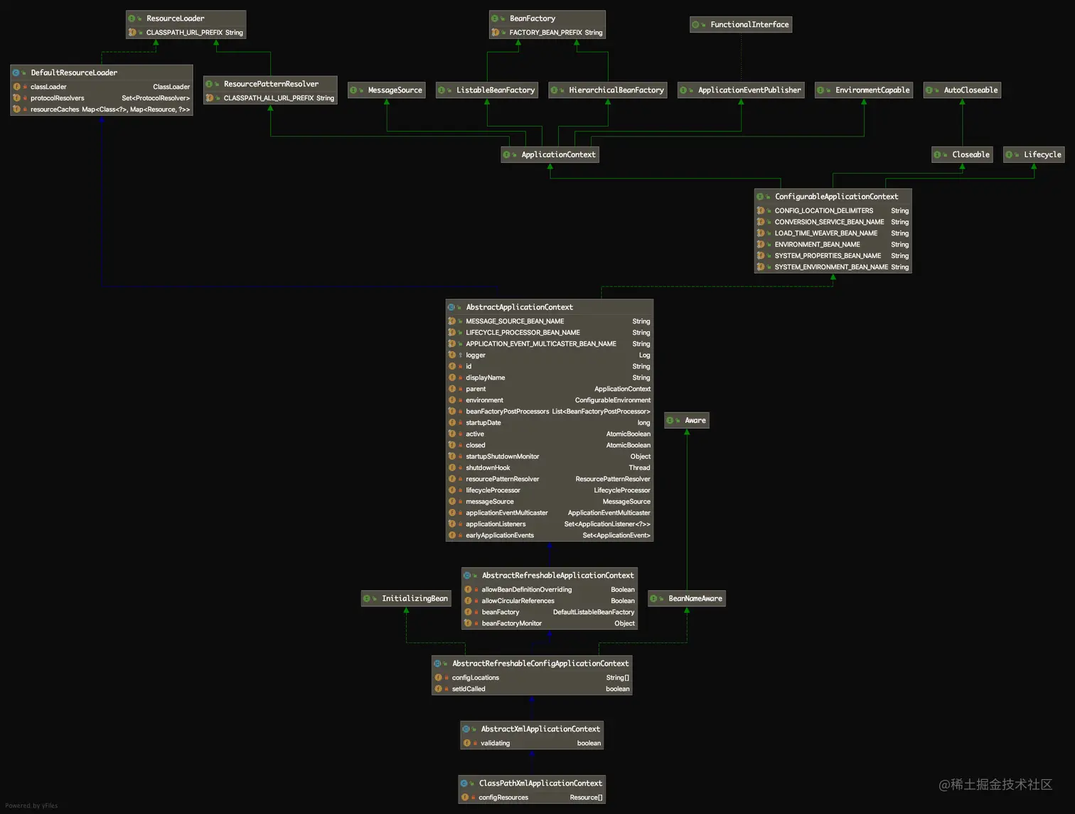 - AbstractApplicationContext:抽象类,继承了ApplicationContext接口,并持有一个ConfigurableListableBeanFactory成员变量,实现了getBean方法,具有初始化Bean工厂(初始化所有的bean)和获取bean对象的能力
