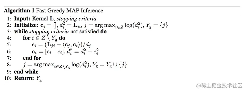 通过以上优化,每次逐步增加一个item,进而获得最终的推荐列表,使得整体求解复杂度从成功降到了,但实际计算中需保证矩阵的半正定,论文中给出的方法是若L的特征值为负值,则将该值替换为0。具体求解过程如下: