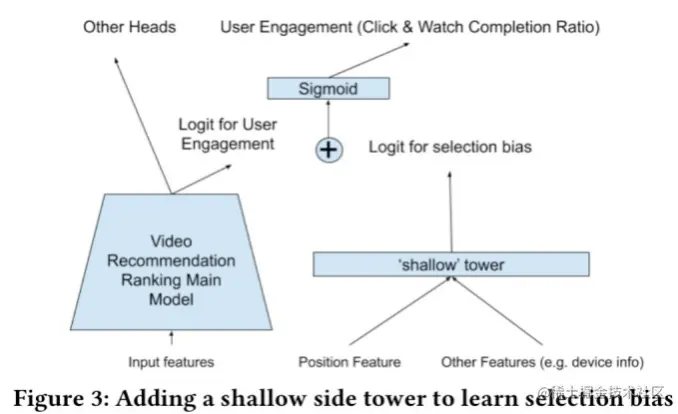 单独设置一个shallow tower(Youtube Recsys19)来预测偏置,输入的特征是一些与偏置相关的特征。在最后的 sigmoid 前,将shallow tower的输出结果加到logit中,线上预估时位置偏差特征取值为missing。
