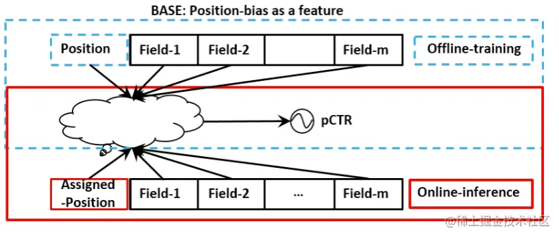 以position bias为例,在训练时将 position 当作一个特征进行输入,在预测时以一个默认值进行输入,即假设所有item出现在同一位置预测点击率,对比用户偏好。