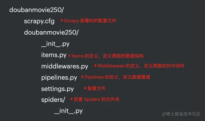 创建一个 Scrapy 项目,项目文件可以直接用 scrapy 命令生成,命令如下所示:scrapy startproject doubanmovie250 这个命令可以在任意文件夹运行。如果提示权限问题,可以加 sudo 运行该命令。这个命令将会创建一个名为 doubanmovie250 的文件夹,文件夹结构如下所示: