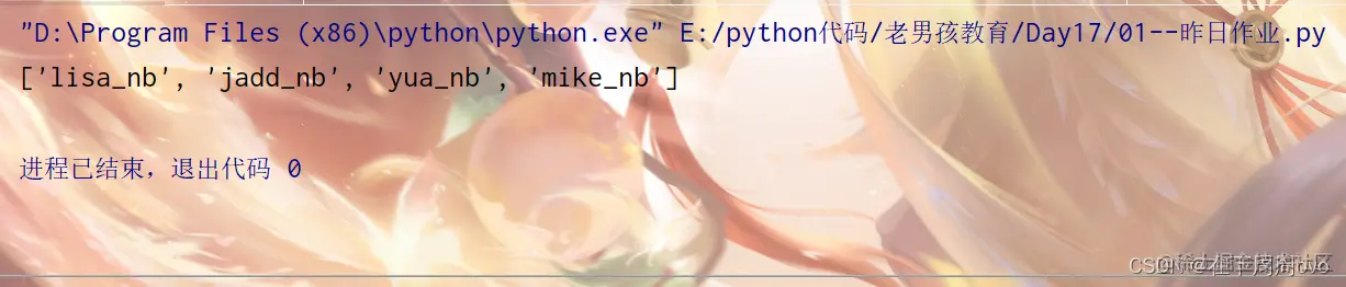 name=['lisa','jadd','yua','mike'] def func(li): li = li+'_nb' return li ret = map(func,name) name = [i for i in ret] print(name)