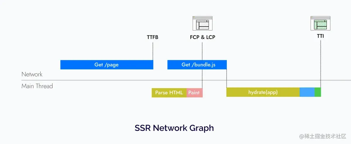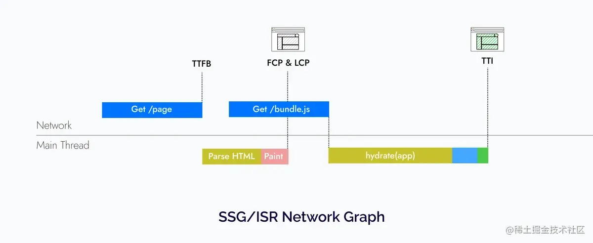 - 由于我们在每次请求时首先在服务端渲染页面,并且必须等待页面的数据需求,这可能会导致 TTFB 速度变慢。这可能是由多种原因导致的,包括未优化的服务端代码或者许多并发的服务端请求。不过,使用像 Next.js 这样的框架可以提前生成页面并使用 SSG(静态站点生成)和 ISR(增量静态站点生成)等技术将它们缓存在服务端,从而在一定程度上解决了这个问题。
