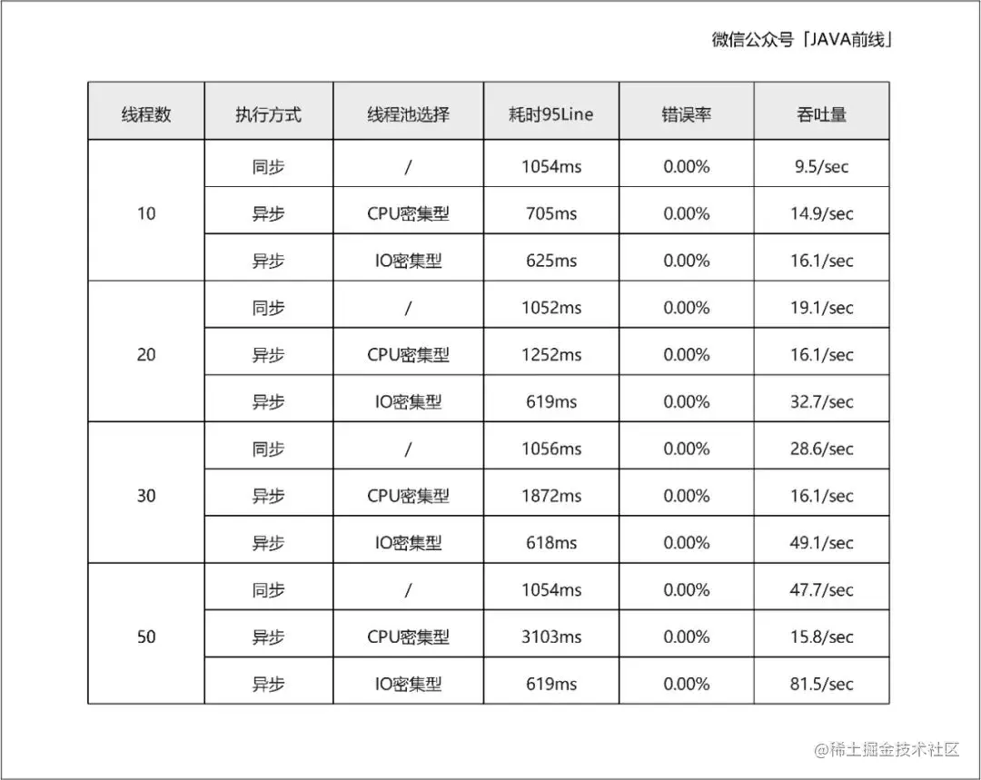本文第一编写了同步和异步代码,并在代码中输出了耗时日志。第二分析单次执行同步和异步的表现,异步优于同步。第三结合不同线程池配置进行压测,如果线程池选择不合适,异步执行性能不如同步,所以应该配置合适线程数。